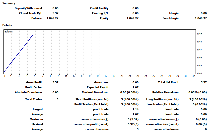 いまのところ 5連勝中です。使っている EA は損失の出にくい BM(仮称)の1つのみ。