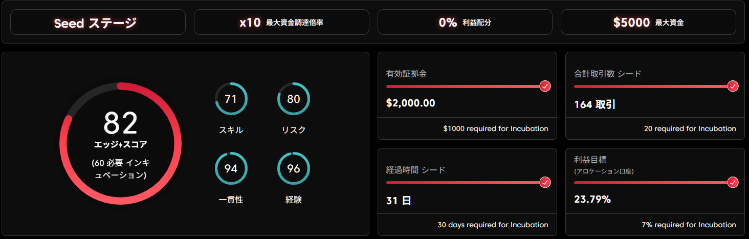 エッジスコアは、スキル、リスク、一貫性、経験の数値から計算され、現在 82 です。