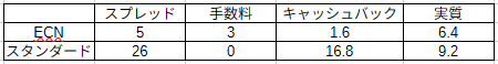 スタンダードと ECN の実質スプレッドの比較は以下の通り。