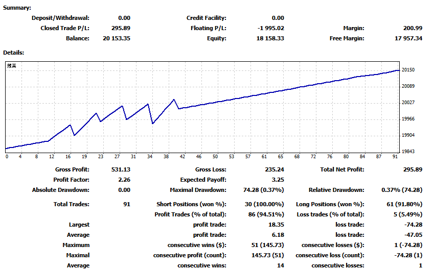 この EA の勝率は 97%を超えるので 2連敗になるのは 0.09% の確率のはずですが、それが起きました。まあ、1回だけナンピンする EA なので一方的なトレンドに捕まって担ぎ上げられたわけです。