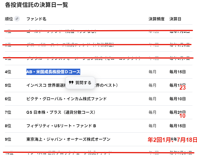 Gemini に「この半年間で高配当ランキング 10位までの投資信託を教えてください。決算日も付け加えて」と訊くと、10教えてくれたのですが、間違いだらけ。