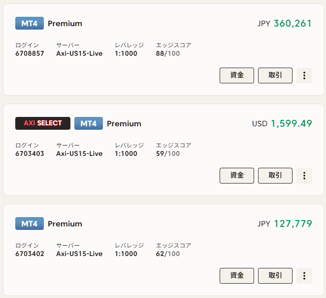 じつは AXI では AXI SELECT(プロップファーム)のほかに普通の口座も2つ所有しており、そちらのエッジスコアは 88 と 62 とどちらも 60超え。