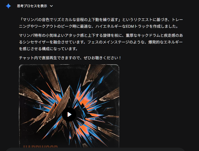 音楽を作曲してくれるというので、「ワークアウト」というサンプルを選んで「マリンバの音色でリズミカルな音程の上下動を繰り返す」とプロンプトを与えたところ 2分36秒のクールな楽曲を作ってくれました。